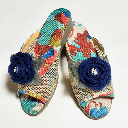 No1754コサージュ飾り付きサテン柄生地外履きサンダル