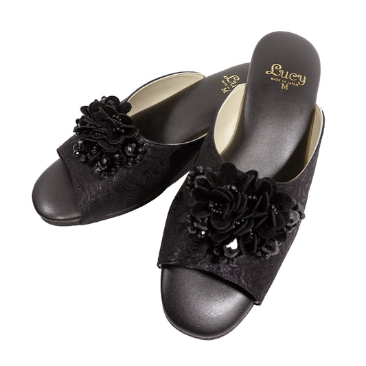 No2754コサージュ飾り付きサテン柄生地外履きスリッパ