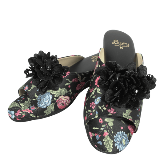 No1754コサージュ飾り付きサテン柄生地外履きサンダル