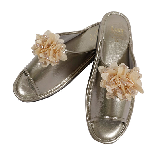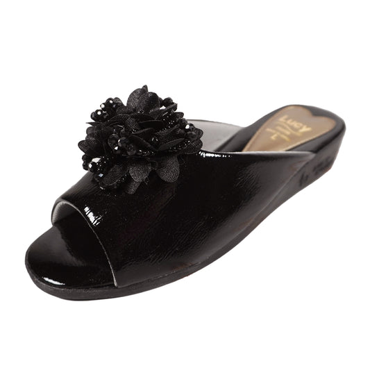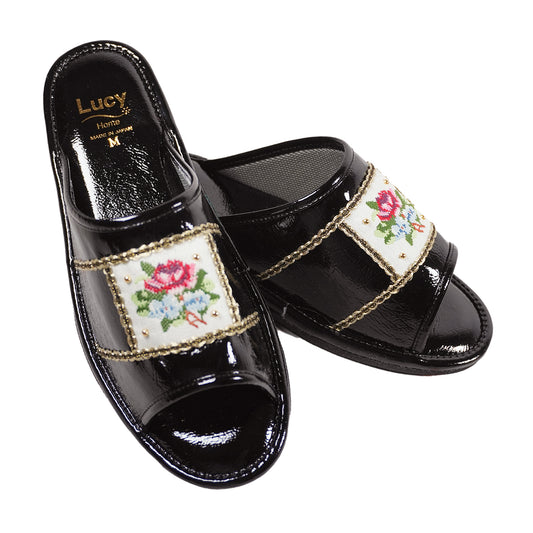No1823フラワー飾り付きパティエナメル生地室内履きスリッパ