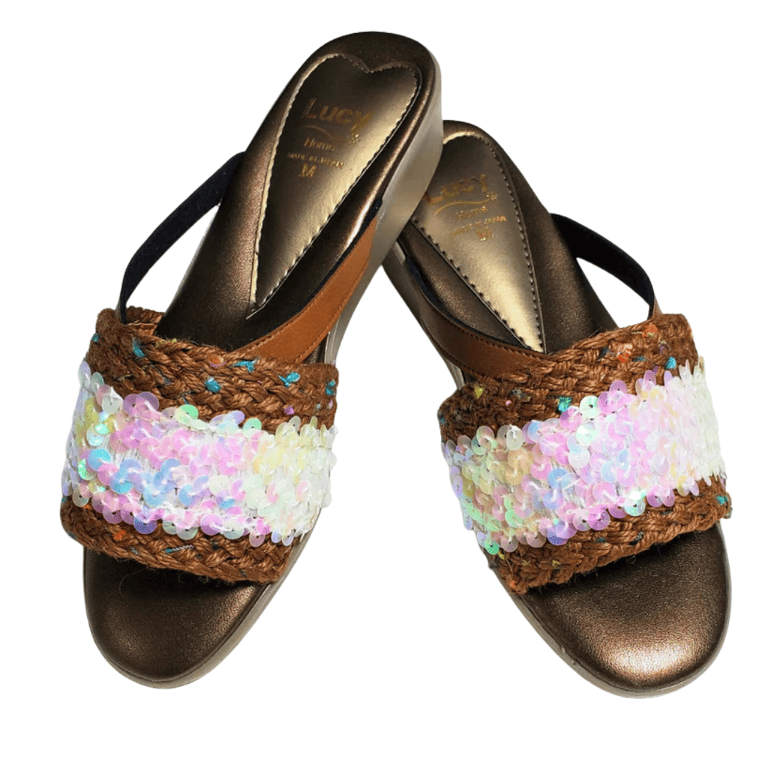 煌めきとゴージャスさを足元に。常夏のイメージのバンド部分に、スパンコールがレンズフレアのように太陽を思わせます。晴れやかな夏の日に、気分を盛り上げたい時にぴったりの一足です。